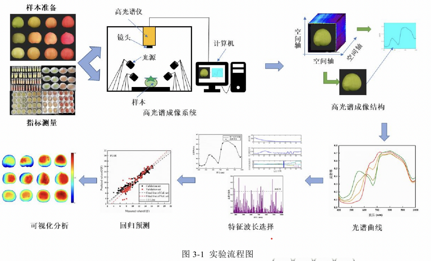 本研究基于高光譜成像系統FS20系列,分別對番茄果實的形態結構性狀和組分含量性狀以及綜合表型性狀進行檢測,并研制了一種無損、快速的高通量番茄果實表型獲取平臺。采用高光譜成像系統獲取番茄果實的光譜圖像信息,然后首先通過對光譜圖像進行分析,獲取形態結構性狀(縱徑、橫徑、果形指數和重量),隨之測量番茄果實顏色性狀(L*、a *、b*、c*、b*和a*/b*)、和組分含量表型性狀(硬度、SsC、番茄紅素、可滴定酸、可溶性糖和 VC 值)。首先,通過高光譜成像系統拍攝番茄果實圖像,利用圖像處理的方法提取光譜圖像的橫徑與縱徑信息以此獲取番茄果實的形態結構性狀。其次, 提出劃分成熟度的指標并定義閾值,對于確定番茄果實最佳采摘期以及果實運輸、儲存與保鮮具有重要的指導意義。最后,基于連續投影算法(SPA)挑選特征波長,構建番茄果實顏色和組分含量性狀表型的偏最小二乘回歸(PLSR)表型預測模型。