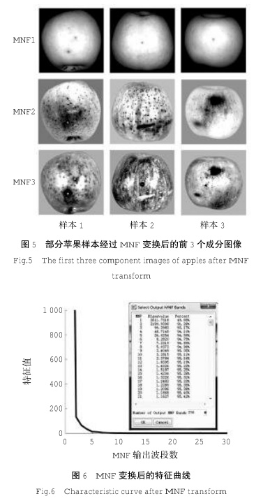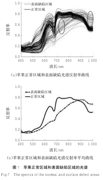 蘋果樣本高光譜圖像經過MNF變換后的前15個波段對應的特征值均大于1.4,且前15個 MNF成分累積百分比超過95.25名,進而選取前15個MNF成分圖像進行反向MNF變換,有效地解決了蘋果高光譜圖像中存在的噪聲。完好無損和表面有缺陷蘋果的高光譜圖像的光譜反射率值在700nm~800nm以及900nm~1000nm波段范圍內具有明顯的差異,選取717.98nm處的光譜反射率值小于0.6以及982.59nm處的光譜反射率值大于0.52作為區分蘋果正常區域和表面缺陷區域的閾值條件,通過閾值分割方法識別出表面有缺陷的蘋果,該檢測方法對80個完好無損蘋果和40個表面有缺陷蘋果的正確識別率分別為97.58%和95%。實驗結果為開發蘋果表面缺陷在線快速檢測系統提供基礎。
