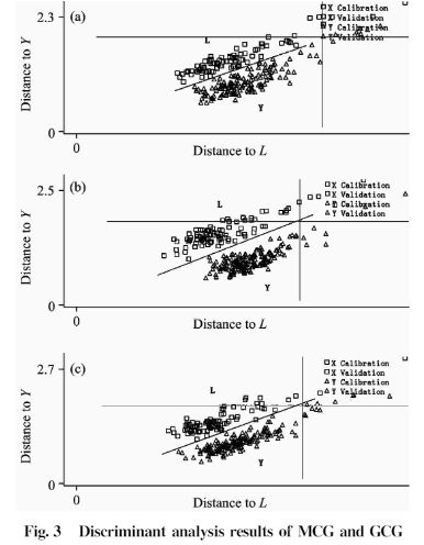 采用近紅外光譜漫反射分析技術,結合主成分分析-馬氏距離法進行判別分析建立了林下山參與園參及不同生長年限林下山參的無損鑒別模型。結果表明,運用近紅外光譜法對林下山參與園參、不同生長年限的林下山參均能正確分類,并實現零誤判。以累計貢獻率和誤判數優選了主成分數。預處理方法為∶采用原始光譜、無平滑識別不同生長年限效果最佳;而采用原始光譜、平滑建立林下山參和園參效果最佳。考慮到10 000~4 000 cm 范圍信息量更全,有利于定性分析因此選擇全波譜范圍建立模型。依據性能指數優選得到的最佳掃描部位均為主根上部。實驗收集的樣品多,來源廣泛,具有代表性,無需復雜前處理。該方法具有準確、快速、無損檢測、成本低、無污染等優點,可實際用于林下山參的質量控制,并提高我國林下山參的市場形象,促進人參市場健康發展。